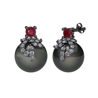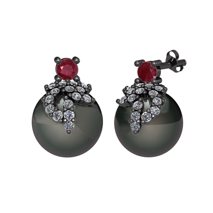 Kök yakut, pırlanta ve siyah inci 925 ayar siyah rodyum kaplama gümüş küpe (0.352 karat)