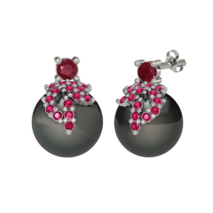 Kök yakut, rodolit garnet ve siyah inci 18 ayar beyaz altın küpe