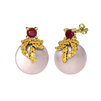 Kök yakut, sitrin ve pembe inci 14 ayar altın küpe