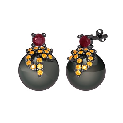 Kök yakut, sitrin ve siyah inci 925 ayar siyah rodyum kaplama gümüş küpe