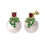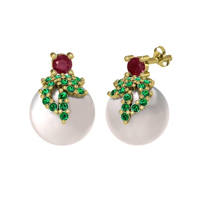 Kök yakut, yeşil kuvars ve inci 18 ayar altın küpe