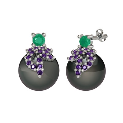 Kök zümrüt, ametist ve siyah inci 925 ayar gümüş küpe