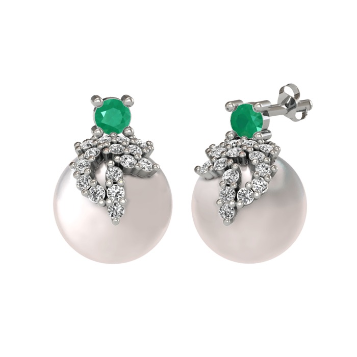 Kök zümrüt, beyaz zirkon ve inci 925 ayar gümüş küpe