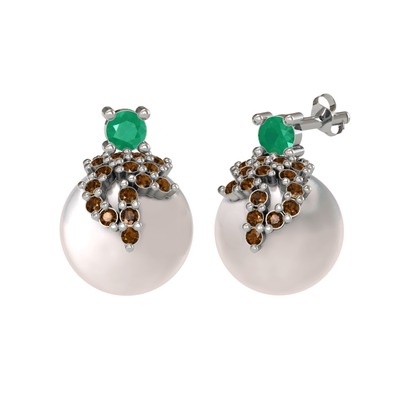 Kök zümrüt, dumanlı kuvars ve inci 925 ayar gümüş küpe