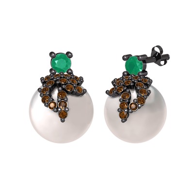 Kök zümrüt, dumanlı kuvars ve inci 925 ayar siyah rodyum kaplama gümüş küpe