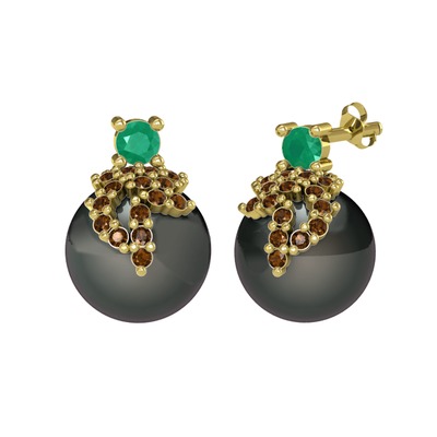 Kök zümrüt, dumanlı kuvars ve siyah inci 18 ayar altın küpe