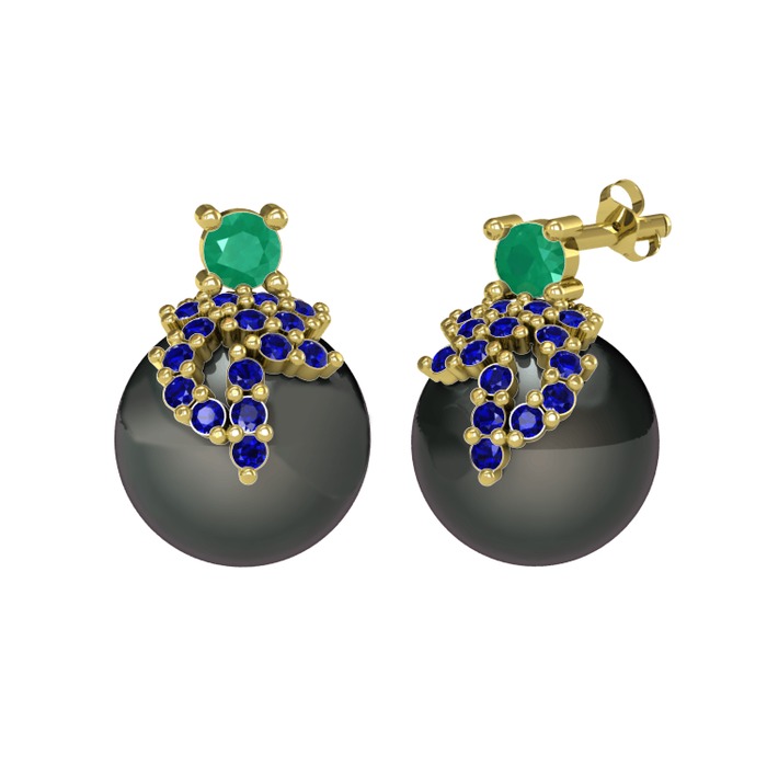 Kök zümrüt, lab safir ve siyah inci 14 ayar altın küpe