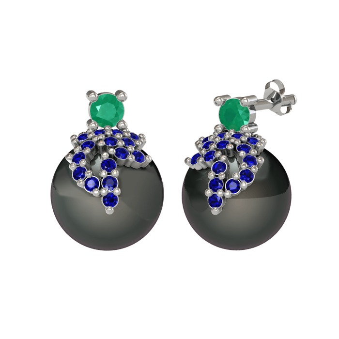 Kök zümrüt, lab safir ve siyah inci 8 ayar beyaz altın küpe