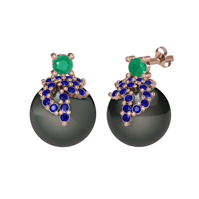 Kök zümrüt, lab safir ve siyah inci 8 ayar rose altın küpe