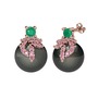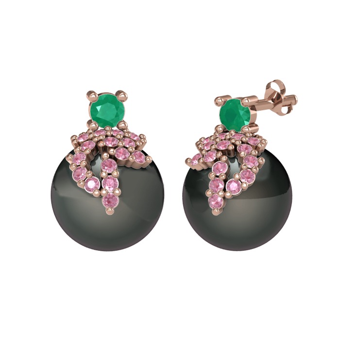 Kök zümrüt, pembe kuvars ve siyah inci 18 ayar rose altın küpe