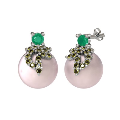 Kök zümrüt, peridot ve pembe inci 925 ayar gümüş küpe