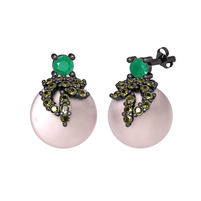 Kök zümrüt, peridot ve pembe inci 925 ayar siyah rodyum kaplama gümüş küpe