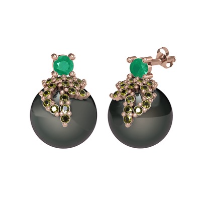 Kök zümrüt, peridot ve siyah inci 18 ayar rose altın küpe
