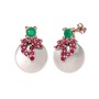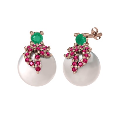 Kök zümrüt, rodolit garnet ve inci 14 ayar rose altın küpe