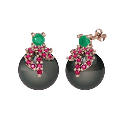 Kök zümrüt, rodolit garnet ve siyah inci 18 ayar rose altın küpe