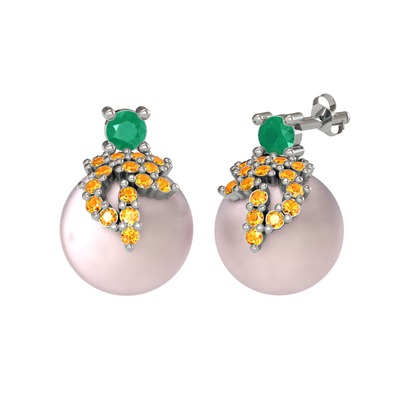 Kök zümrüt, sitrin ve pembe inci 18 ayar beyaz altın küpe