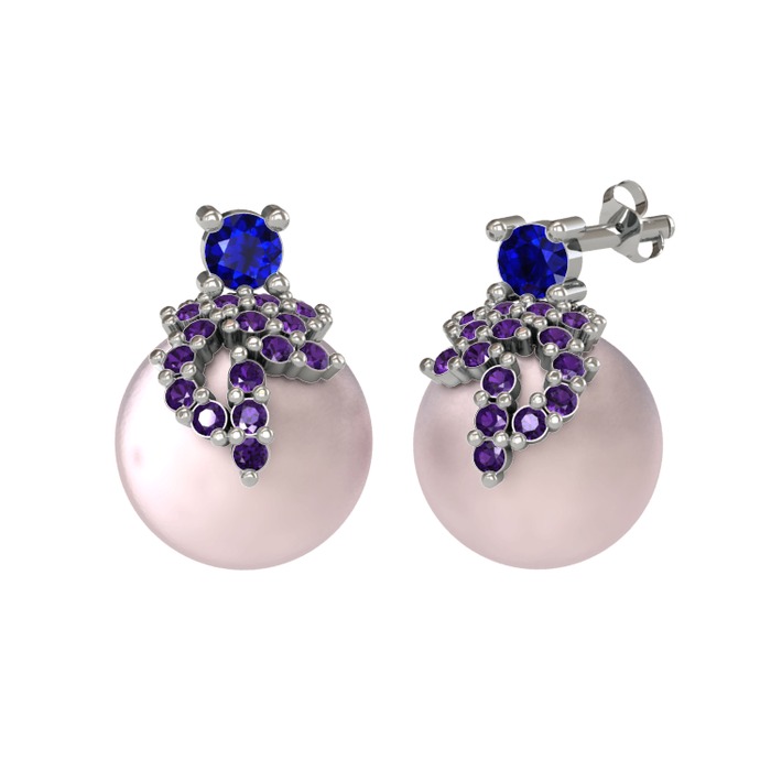 Lab safir, ametist ve pembe inci 8 ayar beyaz altın küpe