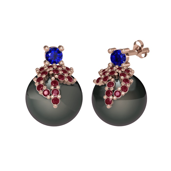 Lab safir, kök yakut ve siyah inci 18 ayar rose altın küpe