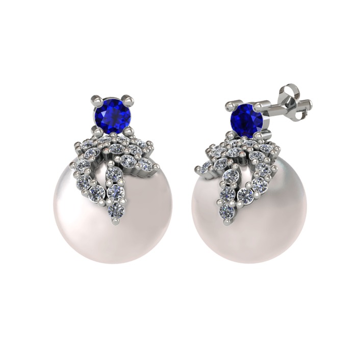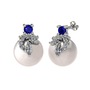 Lab safir, pırlanta ve inci 18 ayar beyaz altın küpe (0.352 karat)
