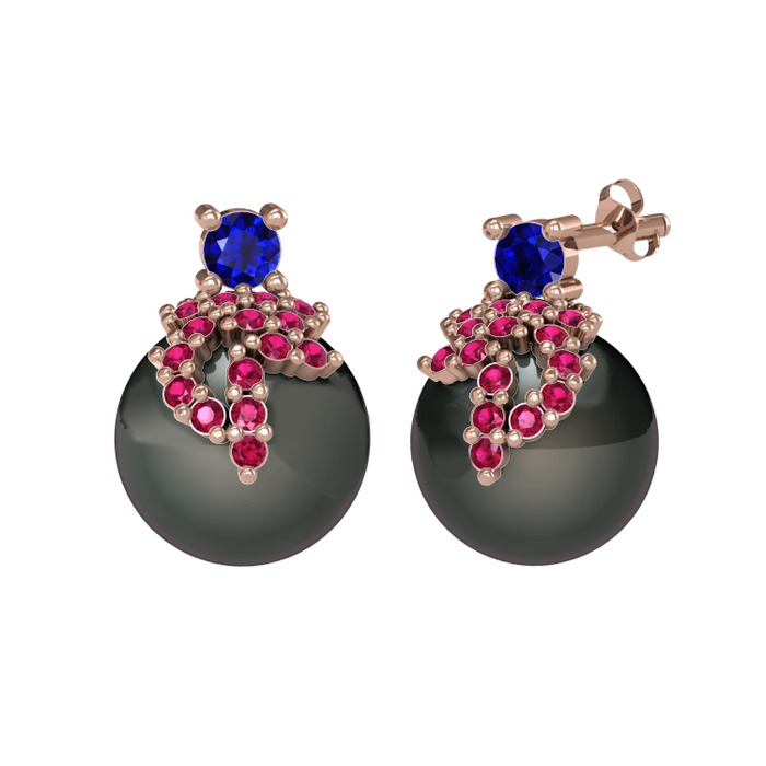 Lab safir, rodolit garnet ve siyah inci 18 ayar rose altın küpe