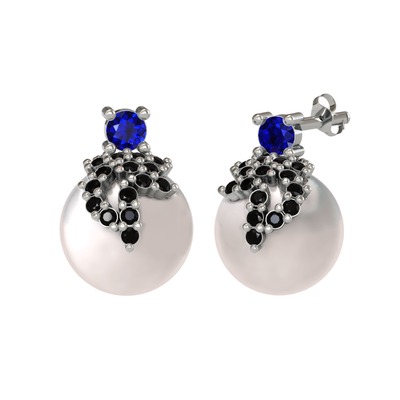 Lab safir, siyah zirkon ve inci 14 ayar beyaz altın küpe