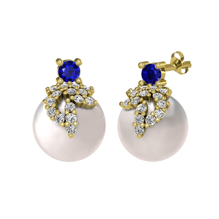 Lab safir, swarovski ve inci 925 ayar altın kaplama gümüş küpe