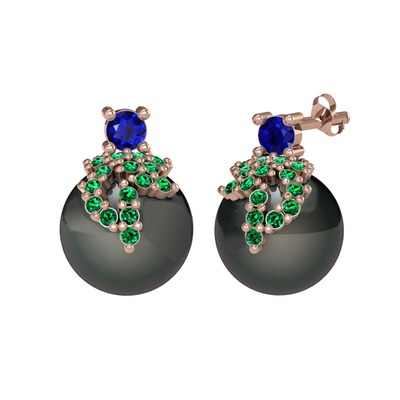 Lab safir, yeşil kuvars ve siyah inci 14 ayar rose altın küpe