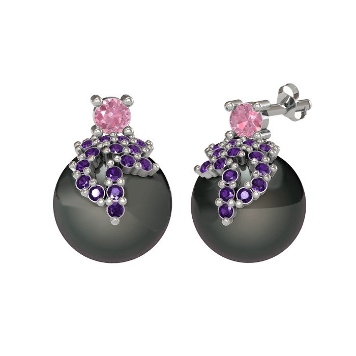 Pembe kuvars, ametist ve siyah inci 8 ayar beyaz altın küpe