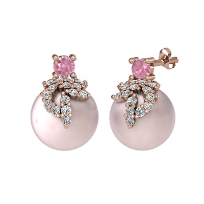 Pembe kuvars, beyaz zirkon ve pembe inci 8 ayar rose altın küpe