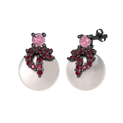 Pembe kuvars, kök yakut ve inci 925 ayar siyah rodyum kaplama gümüş küpe