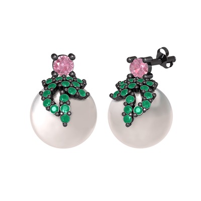 Pembe kuvars, kök zümrüt ve inci 925 ayar siyah rodyum kaplama gümüş küpe