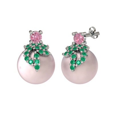 Pembe kuvars, kök zümrüt ve pembe inci 18 ayar beyaz altın küpe