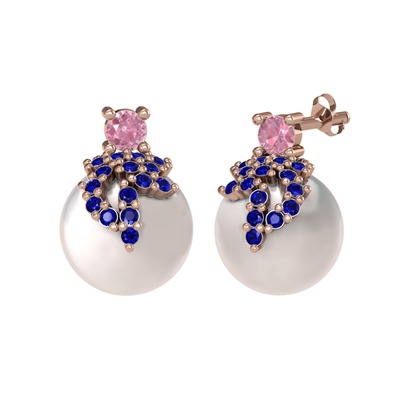 Pembe kuvars, lab safir ve inci 14 ayar rose altın küpe