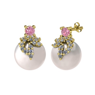 Pembe kuvars, pırlanta ve inci 14 ayar altın küpe (0.352 karat)