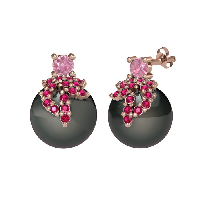 Pembe kuvars, rodolit garnet ve siyah inci 8 ayar rose altın küpe