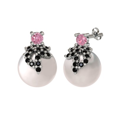 Pembe kuvars, siyah zirkon ve inci 925 ayar gümüş küpe