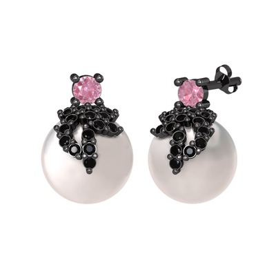 Pembe kuvars, siyah zirkon ve inci 925 ayar siyah rodyum kaplama gümüş küpe
