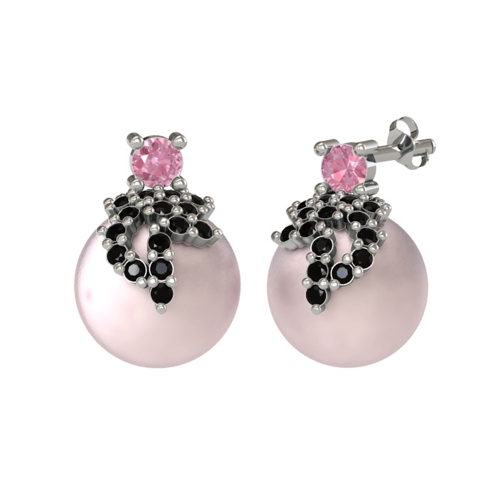 Pembe kuvars, siyah zirkon ve pembe inci 18 ayar beyaz altın küpe