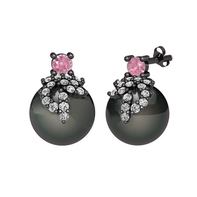 Pembe kuvars, swarovski ve siyah inci 925 ayar siyah rodyum kaplama gümüş küpe