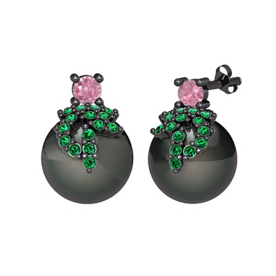 Pembe kuvars, yeşil kuvars ve siyah inci 925 ayar siyah rodyum kaplama gümüş küpe