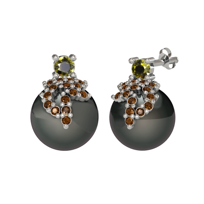 Peridot, dumanlı kuvars ve siyah inci 18 ayar beyaz altın küpe