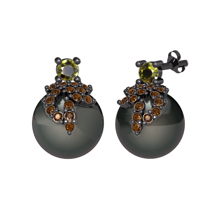 Peridot, dumanlı kuvars ve siyah inci 925 ayar siyah rodyum kaplama gümüş küpe