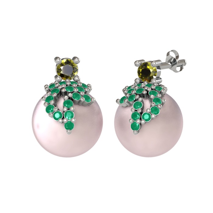 Peridot, kök zümrüt ve pembe inci 14 ayar beyaz altın küpe