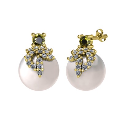 Peridot, pırlanta ve inci 8 ayar altın küpe (0.352 karat)