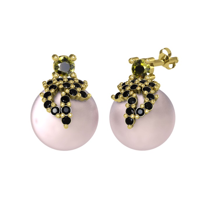 Peridot, siyah zirkon ve pembe inci 14 ayar altın küpe