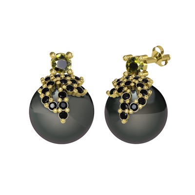 Peridot, siyah zirkon ve siyah inci 8 ayar altın küpe