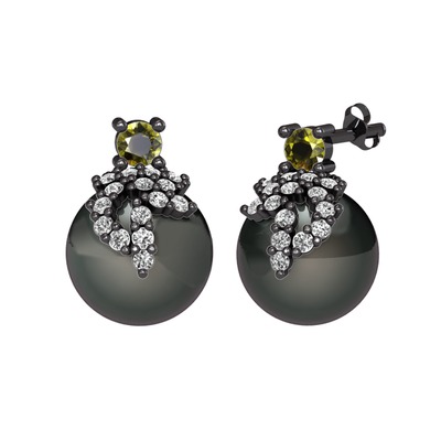 Peridot, swarovski ve siyah inci 925 ayar siyah rodyum kaplama gümüş küpe