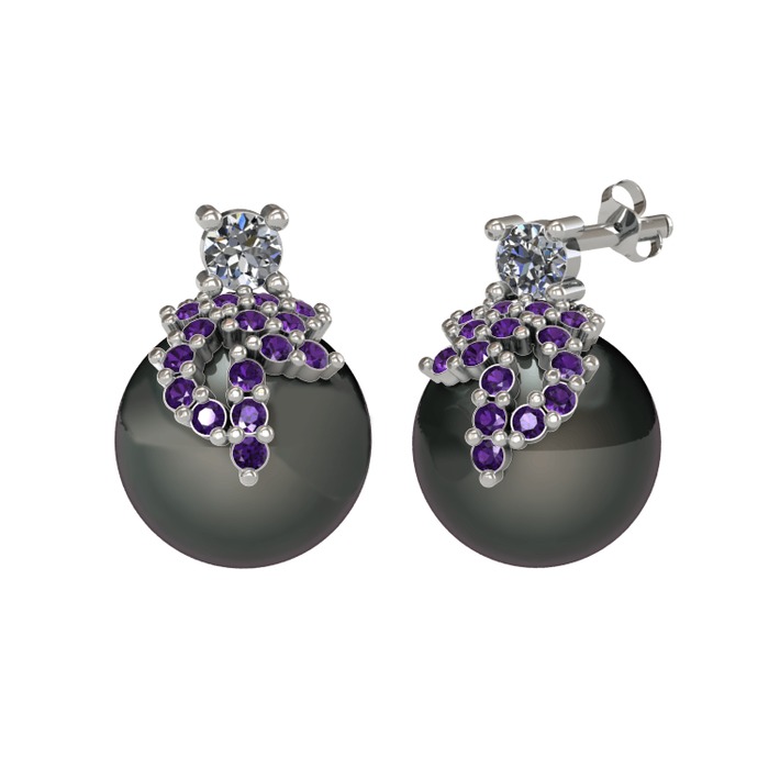 Pırlanta, ametist ve siyah inci 18 ayar beyaz altın küpe (0.22 karat)