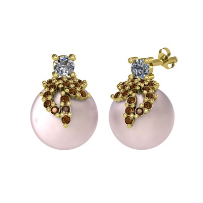 Pırlanta, dumanlı kuvars ve pembe inci 18 ayar altın küpe (0.22 karat)