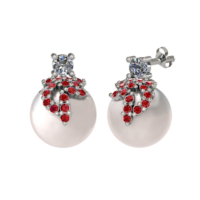 Pırlanta, garnet ve inci 14 ayar beyaz altın küpe (0.22 karat)